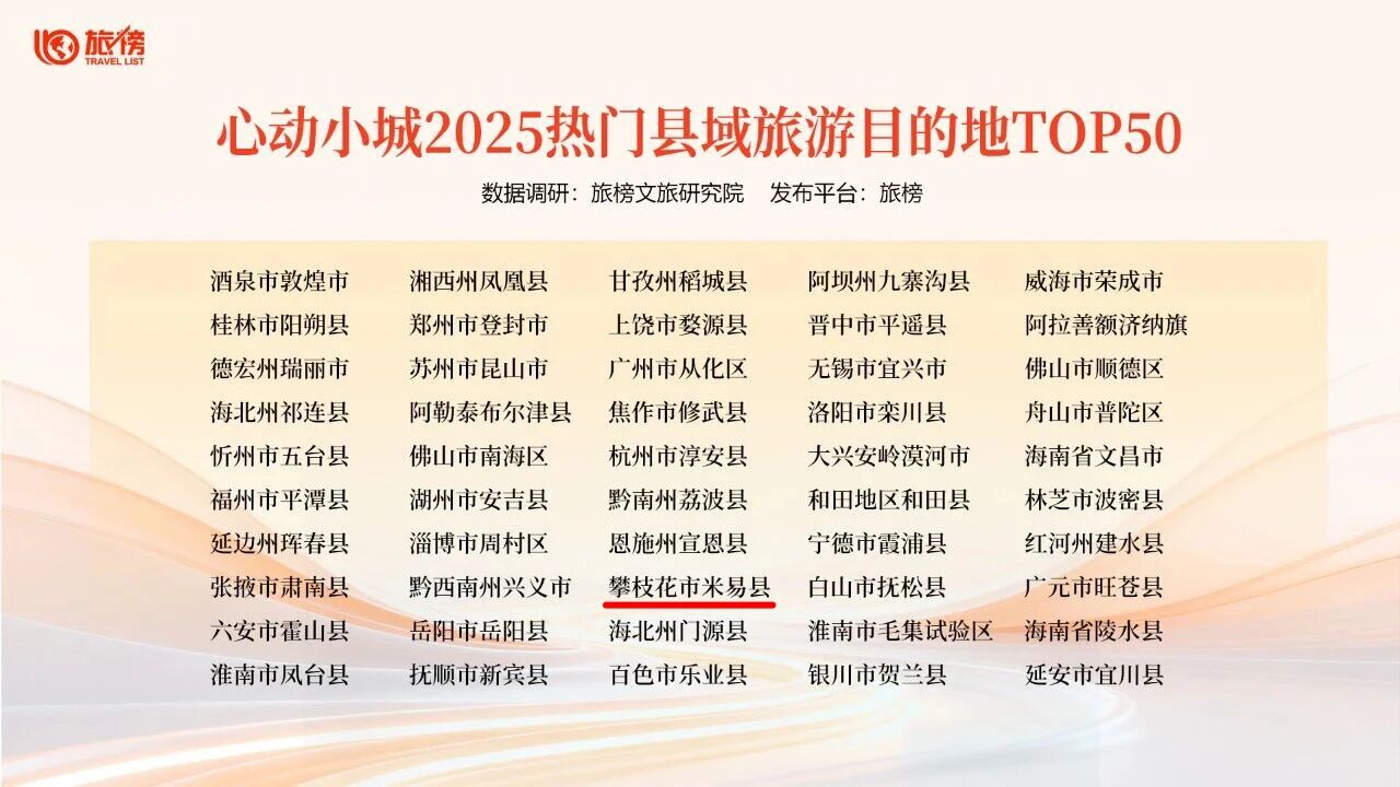 米易县成功入选“心动小城2025热门县域旅游目的地TOP50”榜单