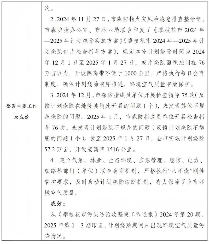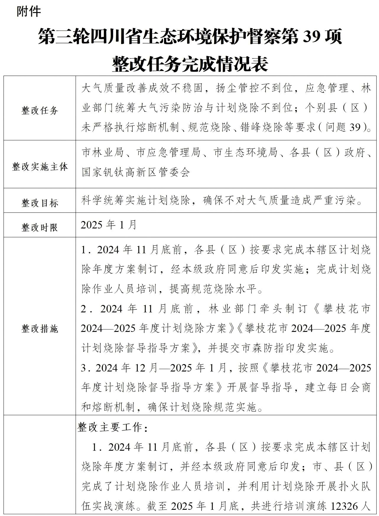 第三轮四川省生态环境保护督察第39项整改任务已整改完成,并通过验收,拟按程序实施销号。根据《四川省生态环境保护督察问题整改销号办法(2025年修订)》有关要求,现将该项任务整改完成情况予以公示,公示期为2025年12月2日至12月15日。公示期间如有异议,请实名书面向攀枝花市林业局、攀枝花市应急管理局提出。联系电话:攀枝花市林业局0812-3551582,攀枝花市应急管理局0812-3324700;邮寄地址:攀枝花市东区攀枝花大道东段470号攀枝花市林业局,攀枝花市东区竹雅巷2号攀枝花市应急管理局。