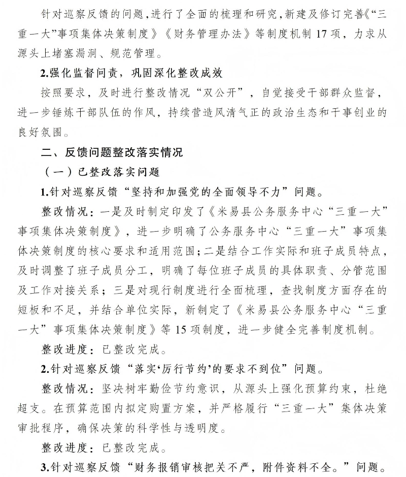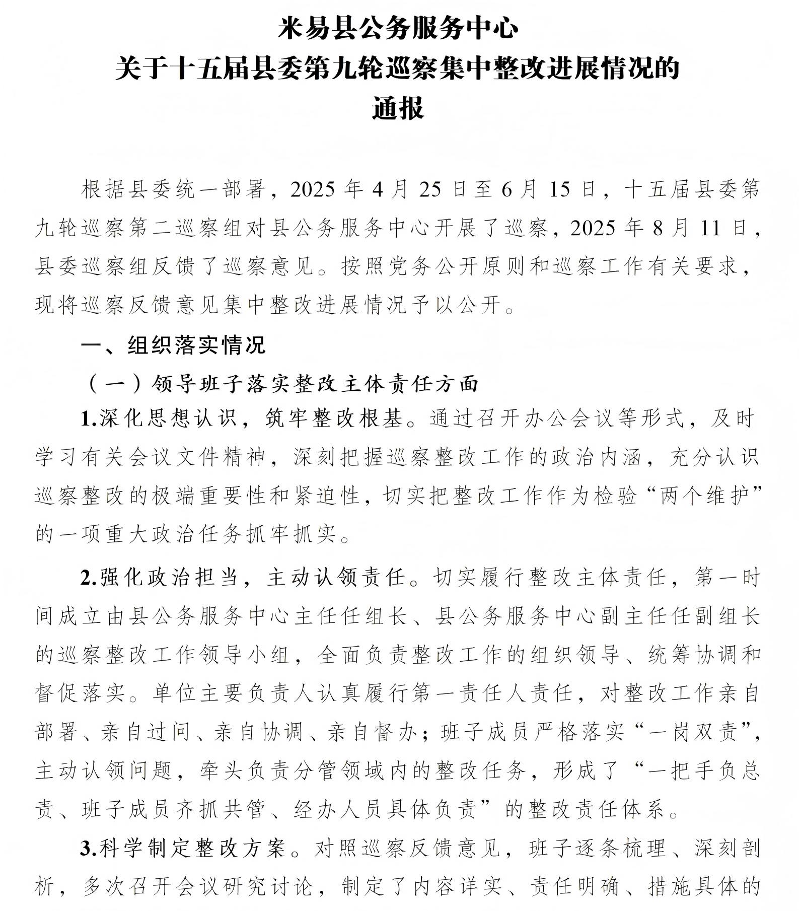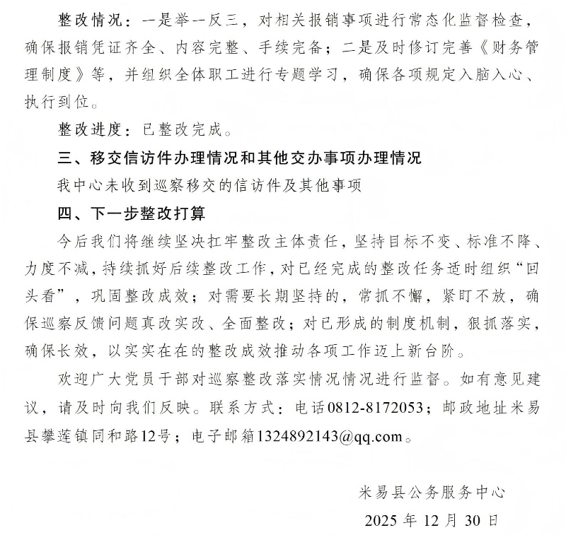米易县公务服务中心关于十五届县委第九轮巡察集中整改进展情况的通报