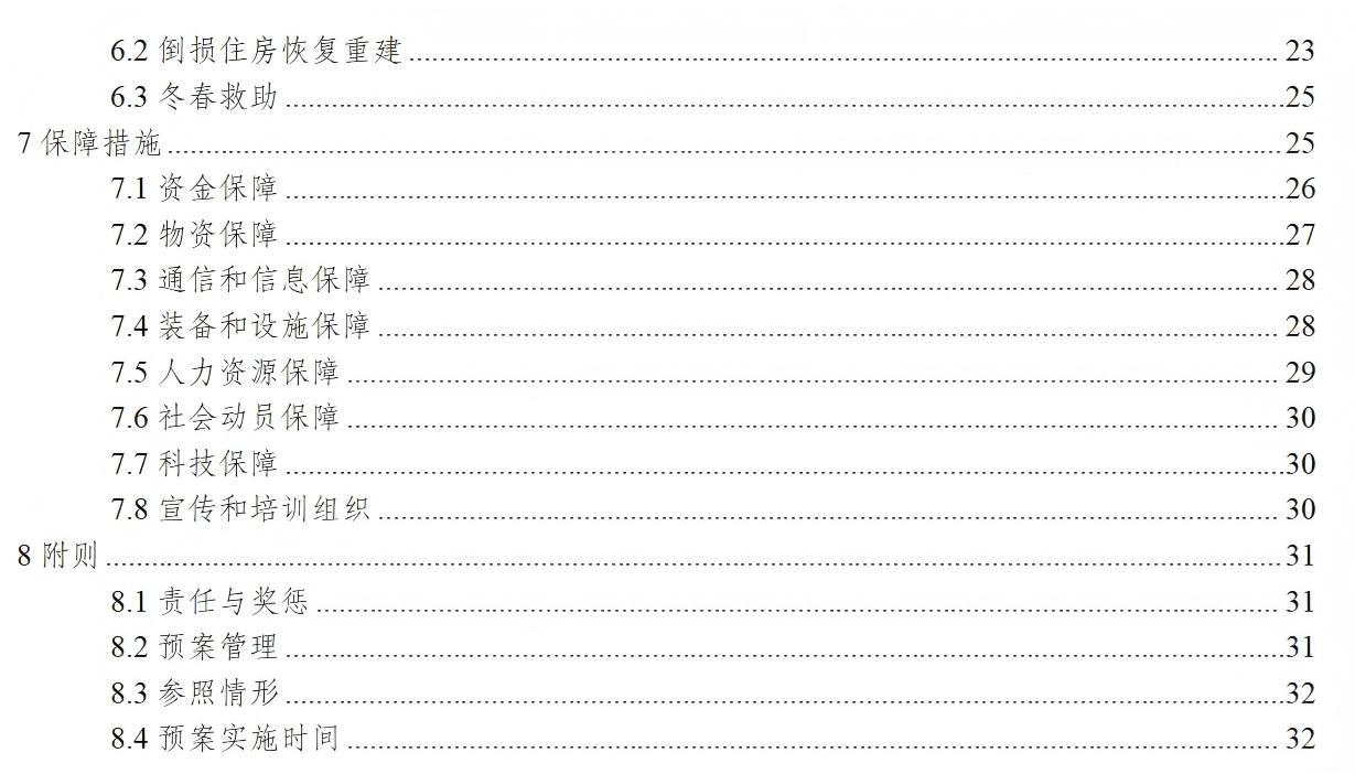 6.2.1县人民政府统筹研究制定因灾倒损住房恢复重建规划和政策,提供资金支持,明确救助标准;受灾乡(镇)人民政府具体负责组织实施。