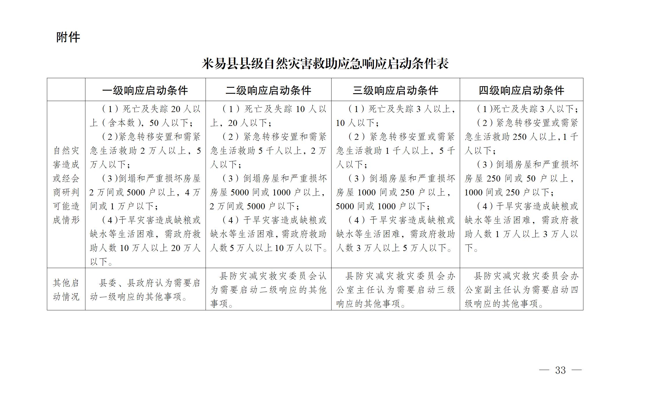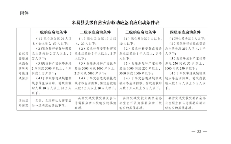 (一)一次灾害过程,造成米易县某一乡(镇)或多个乡(镇)行政区域内,发生重大自然灾害,出现下列情况之一的,启动四级响应:
