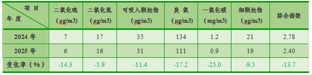 2025年,环境空气质量总监测有效天数为365天,其中优的天数为252天,良的天数为113天,空气优良率为100%。SO2平均浓度值为6μg/m3,NO2平均浓度值为16μg/m3,PM10平均浓度值为31μg/m3,CO日均浓度值第95百分位数为0.9mg/m3,O3日最大8小时平均浓度第90百分位数为111μg/m3,PM2.5平均浓度值为19μg/m3。