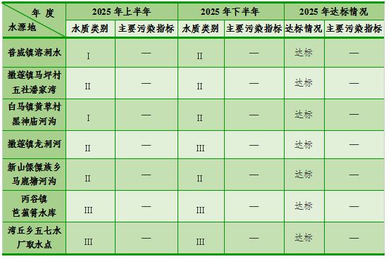 2025年,我县每季度对晃桥水库县级集中式饮用水水源地进行了水质监测,上下半年对乡镇集中式饮用水水源地进行了水质监测,地表水按照《地表水环境质量标准》(GB3838-2002)水质标准评价,地下水按照《地下水质量标准》(GB14848-2017)水质标准评价,全年我县集中式饮用水水源地水质均达到或优于Ⅲ类标准,水质达标率为100%。