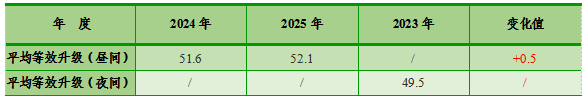 2025年,我县城区区域环境噪声有效测点107个,表征面积4.28km2;交通干道噪声有效测点22个,总长度12.5km。按《环境噪声检测技术规范 城市声环境常规监测》(HJ 640-2012)进行评价,城区区域环境噪声昼间年均值52.1dB(A),达到城市区域环境噪声总体水平二级标准(50.1-55.0dB(A)),总体水平较好;交通干道噪声昼间年均值65.7dB(A),达到道路交通噪声强度等级一级标准(≤68.0dB(A)),总体水平好。