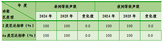 2025年,我县按季度开展功能区声环境质量监测。县城区功能区声环境质量监测点8个,其中2类6个,4a类2个。按照《声环境质量标准》(GB3096-2008)评价,米易县城市声功能区中2类区和4a类区昼间、夜间等效声级均符合环境噪声标准限值的规定,达标率100%。
