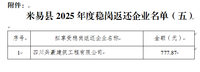 根据《四川省人力资源和社会保障厅 四川省财政厅 国家税务总局四川省税务局关于认真做好延续实施失业保险稳岗惠民政策措施有关工作的通知》(川人社规〔2025〕9号)文件精神和《四川省就业服务管理局关于做好2025年失业保险稳岗返还和一次性扩岗补助经办工作的通知》,经审核,以下单位符合2025年度享受稳岗返还政策条件,现予公示,公示期为2025年12月22日—2025年12月26日。如有异议,请于公示期内反馈。