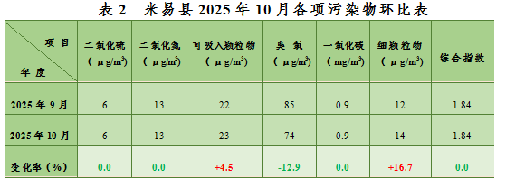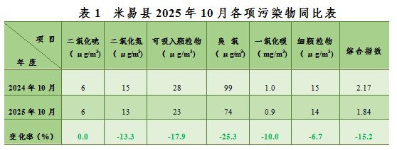 与上年同期相比,空气质量优良率保持不变,除SO2月均浓度保持不变外,NO2、PM10、O3、CO、PM2.5月均浓度均下降。具体情况见表1。