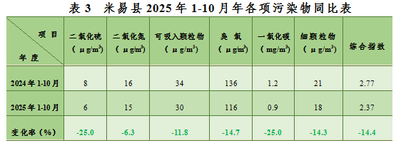 与上年同期相比,空气质量优良率上升0.3%,SO2、NO2、PM10、O3、CO、PM2.5平均浓度值均下降,具体情况见表3。