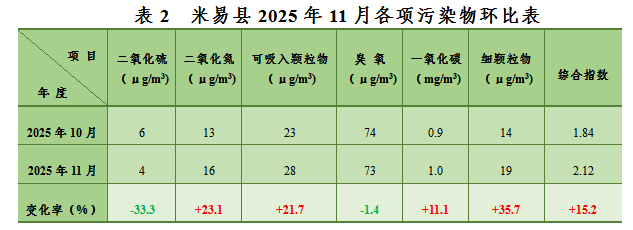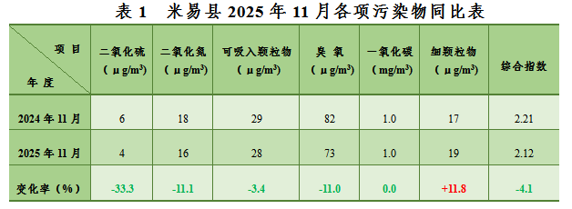 2025年11月,我县对县城空气质量状况开展自动监测,监测项目为二氧化硫(SO2)、二氧化氮(NO2)、可吸入颗粒物(PM10)、一氧化碳(CO)、臭氧(O3)、细颗粒物(PM2.5)。本月监测有效天数30天。按《环境空气质量标准》(GB3095-2012)二级标准评价,优的天数为28天,良的天数2天,空气质量优良率为100%。