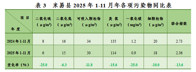 与上年同期相比,空气质量优良率上升0.3%,SO2、NO2、PM10、O3、CO、PM2.5平均浓度值均下降,具体情况见表3。