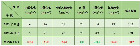 2025年12月,我县对县城空气质量状况开展自动监测,监测项目为二氧化硫(SO2)、二氧化氮(NO2)、可吸入颗粒物(PM10)、一氧化碳(CO)、臭氧(O3)、细颗粒物(PM2.5)。本月监测有效天数31天。按《环境空气质量标准》(GB3095-2012)二级标准评价,优的天数为17天,良的天数14天,空气质量优良率为100%。