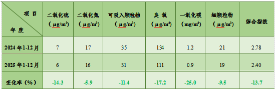 2025年(截至12月31日),环境空气质量总监测有效天数为365天,其中优的天数为252天,良的天数为113天,空气优良率为100%。
