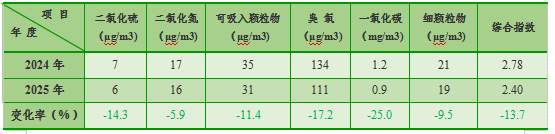 2025年,环境空气质量总监测有效天数为365天,其中优的天数为252天,良的天数为113天,空气优良率为100%。SO2平均浓度值为6μg/m3,NO2平均浓度值为16μg/m3,PM10平均浓度值为31μg/m3,CO日均浓度值第95百分位数为0.9mg/m3,O3日最大8小时平均浓度第90百分位数为111μg/m3,PM2.5平均浓度值为19μg/m3。