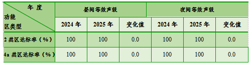 2025年,我县按季度开展功能区声环境质量监测。县城区功能区声环境质量监测点8个,其中2类6个,4a类2个。按照《声环境质量标准》(GB3096-2008)评价,米易县城市声功能区中2类区和4a类区昼间、夜间等效声级均符合环境噪声标准限值的规定,达标率100%。