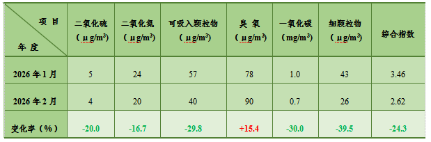2026年(截至2月28日),环境空气质量总监测有效天数为59天,其中优的天数为40天,良的天数为18天,轻度污染的天数1天,空气优良率为98.3%。