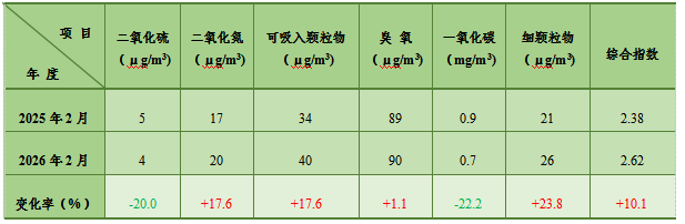 2026年2月,我县对县城空气质量状况开展自动监测,监测项目为二氧化硫(SO2)、二氧化氮(NO2)、可吸入颗粒物(PM10)、一氧化碳(CO)、臭氧(O3)、细颗粒物(PM2.5)。本月监测有效天数28天。按《环境空气质量标准》(GB3095-2012)二级标准评价,优的天数为26天,良的天数为2天,空气质量优良率为100%。