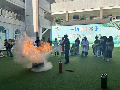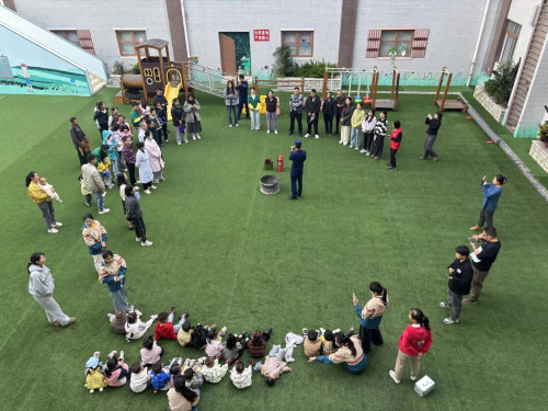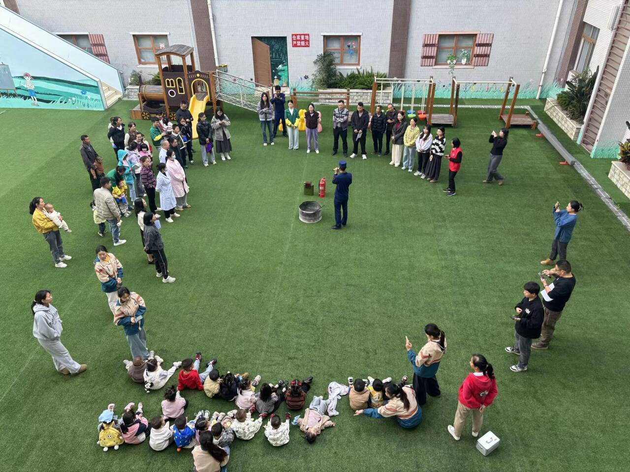 随着火灾警报声骤然响起,中心应急指挥组立即启动火灾应急预案。各岗位工作人员闻令而动,按照预定方案,迅速到达指定位置履行职责。疏散引导组人员立即赶往各自负责的区域,沉着冷静地引导小朋友们用湿毛巾捂住口鼻,弯腰低姿,沿着预定的疏散路线,快速、有序地向一楼中庭安全地带撤离。安全保障组在疏散过程中检查房间,确保无人员滞留。医疗救护组携带急救箱在集结地点待命,准备应对可能出现的意外情况。整个疏散过程紧张有序,用时3分钟。全体人员安全撤离至指定集结区,无拥挤、踩踏等次生事故发生。随后,消防人员向全体参与人员现场讲解并演示了干粉灭火器的正确使用方法、适用火灾类型及操作要点,并指导部分工作人员进行了实际操作,提升大家的实战技能。
