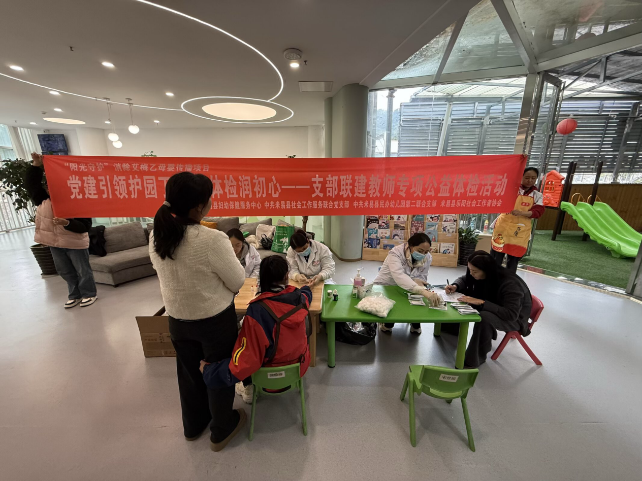 2025年12月3日,在米易县民政局的指导下,米易县妇幼保健服务中心、中共米易县社会工作服务联合党支部、中共米易县民办幼儿园第二联合党支部、米易县乐阳社会工作者协会,共同举办了“党建引领护园丁 健康体检润初心——支部联建教师专项公益体检活动”。