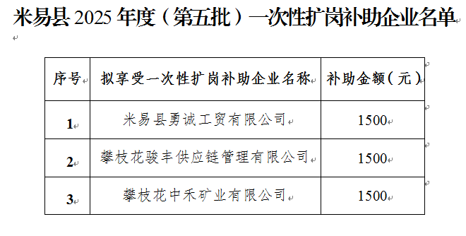 根据《四川省就业服务管理局关于印发失业保险一次性扩岗补助申领指南和经办流程的通知》(川就局函〔2024〕53号)文件规定,现将2025年10月符合一次性扩岗补助申请条件企业名单(名单见附件)进行公示。