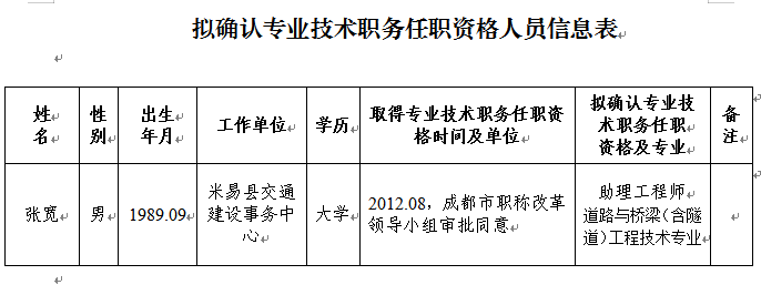 经用人单位考核合格推荐,米易县人力资源和社会保障局审核,同意确认张宽初级专业技术职务任职资格。现将确认信息面向社会进行公示,公示期为2025年11月7日至2025年11月13日。公示期间广大群众若对公示对象有异议,请当面或书面(以真实姓名)向米易县人力资源和社会保障局反映。