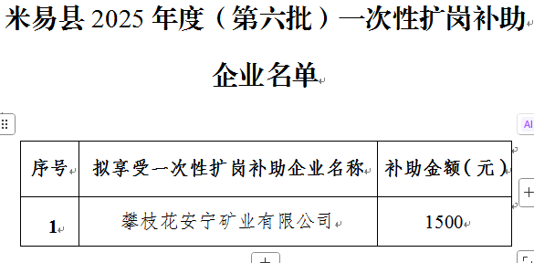 根据《四川省就业服务管理局关于印发失业保险一次性扩岗补助申领指南和经办流程的通知》(川就局函〔2024〕53号)文件规定,现将2025年11月符合一次性扩岗补助申请条件企业名单(名单见附件)进行公示。